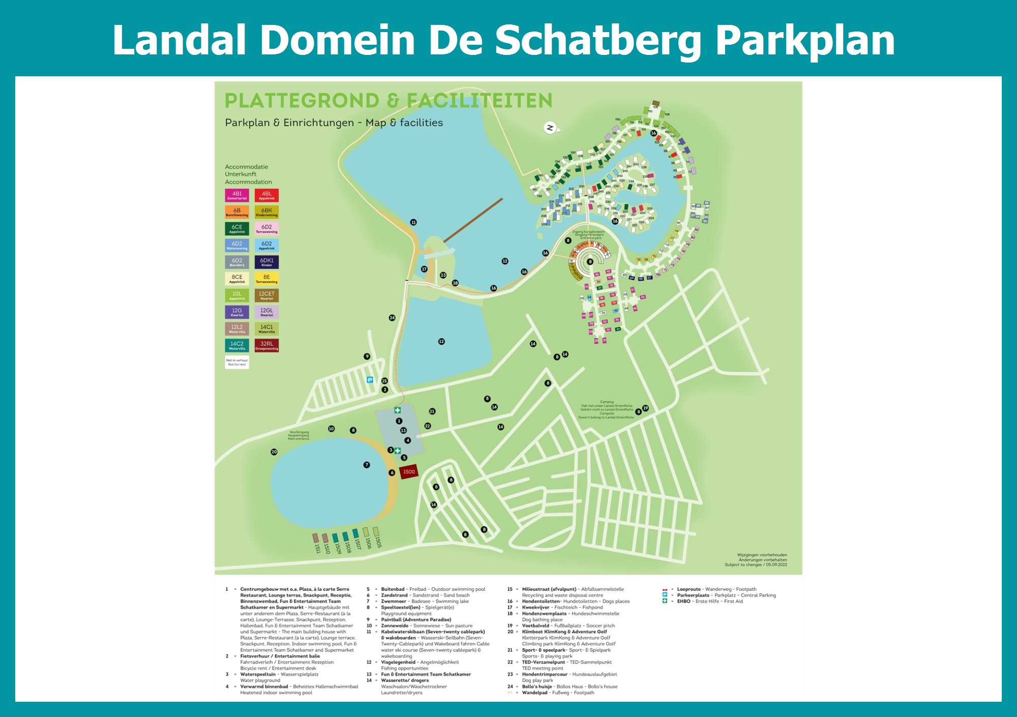 Aktueller und übersichtlicher Parkplan von Landal Domein De Schatberg mit alle Unterkünfte und Einrichtungen, auch als PDF herunterladbar.