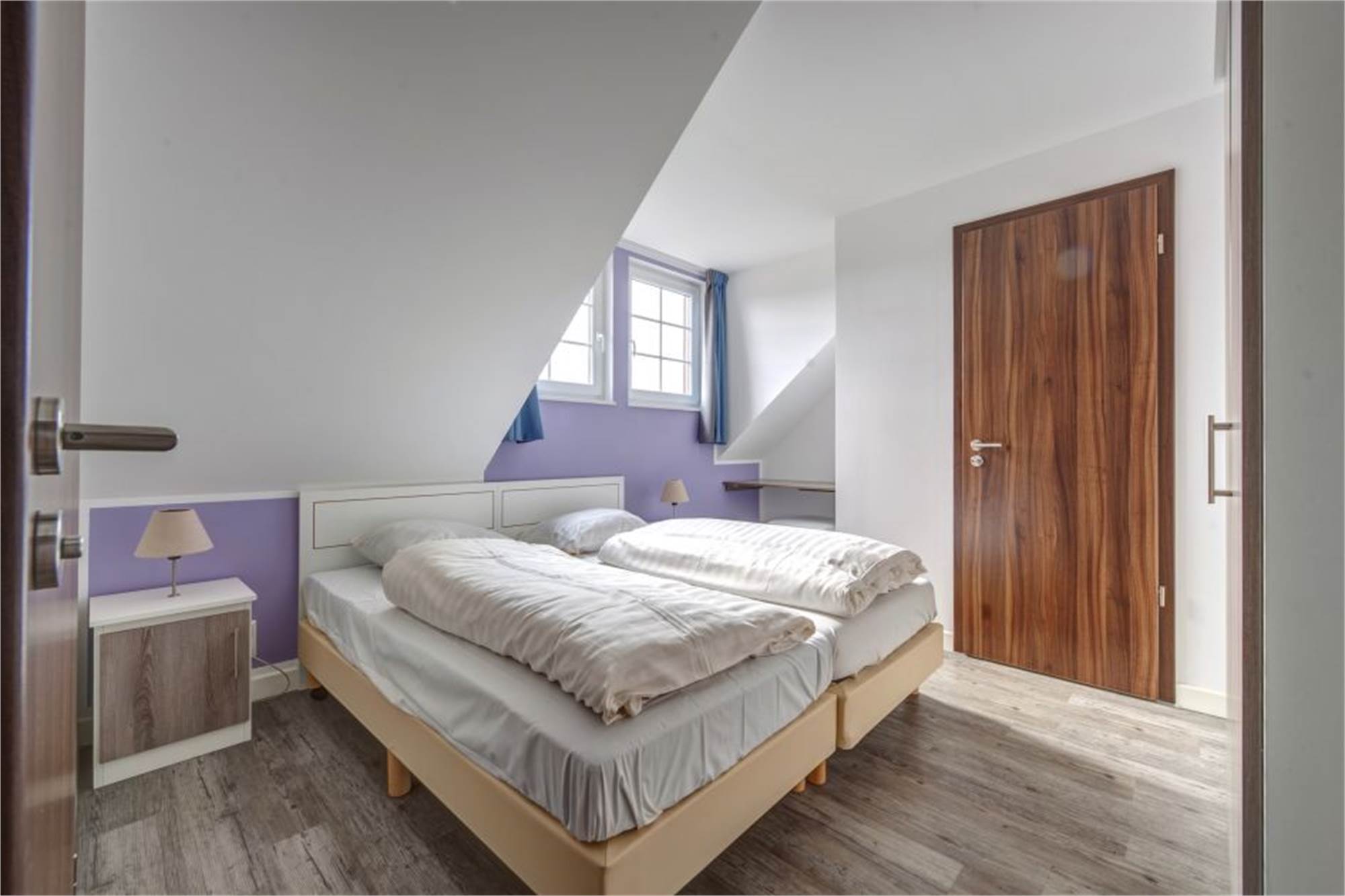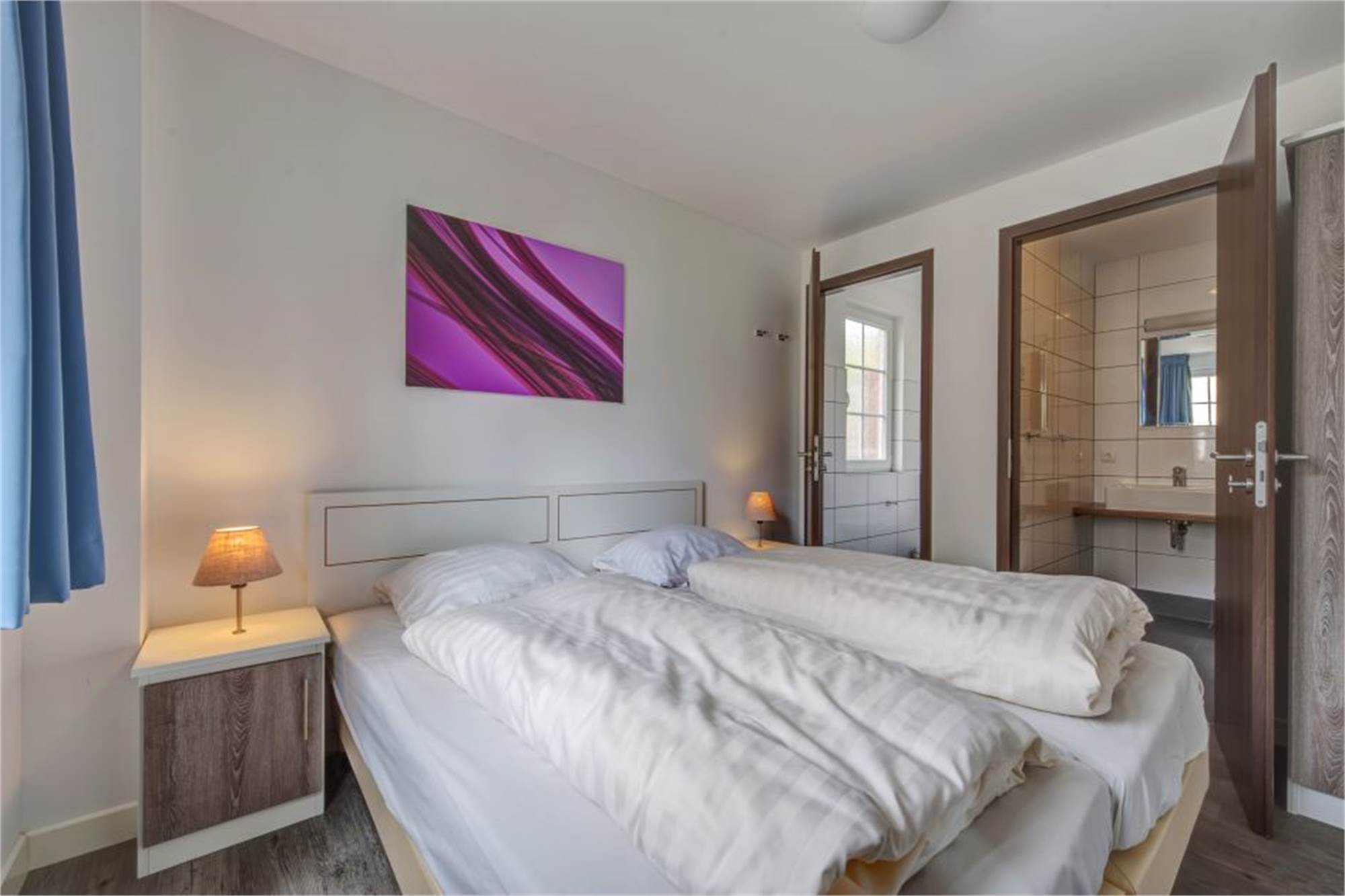 Separate Toilette. Schlafzimmer mit zwei Einzel-Boxspringbetten mit eigenem Badezimmer mit Dusche und Waschtisch und separater Toilette.