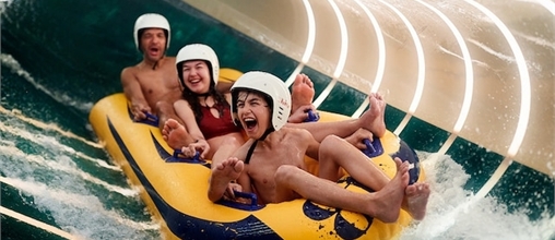 Ausgestattet mit einer Schutzweste und einem Schutzhelm sausen Sie mit einer Rutschmatte den Pentagliss und den Body Slide hinunter!