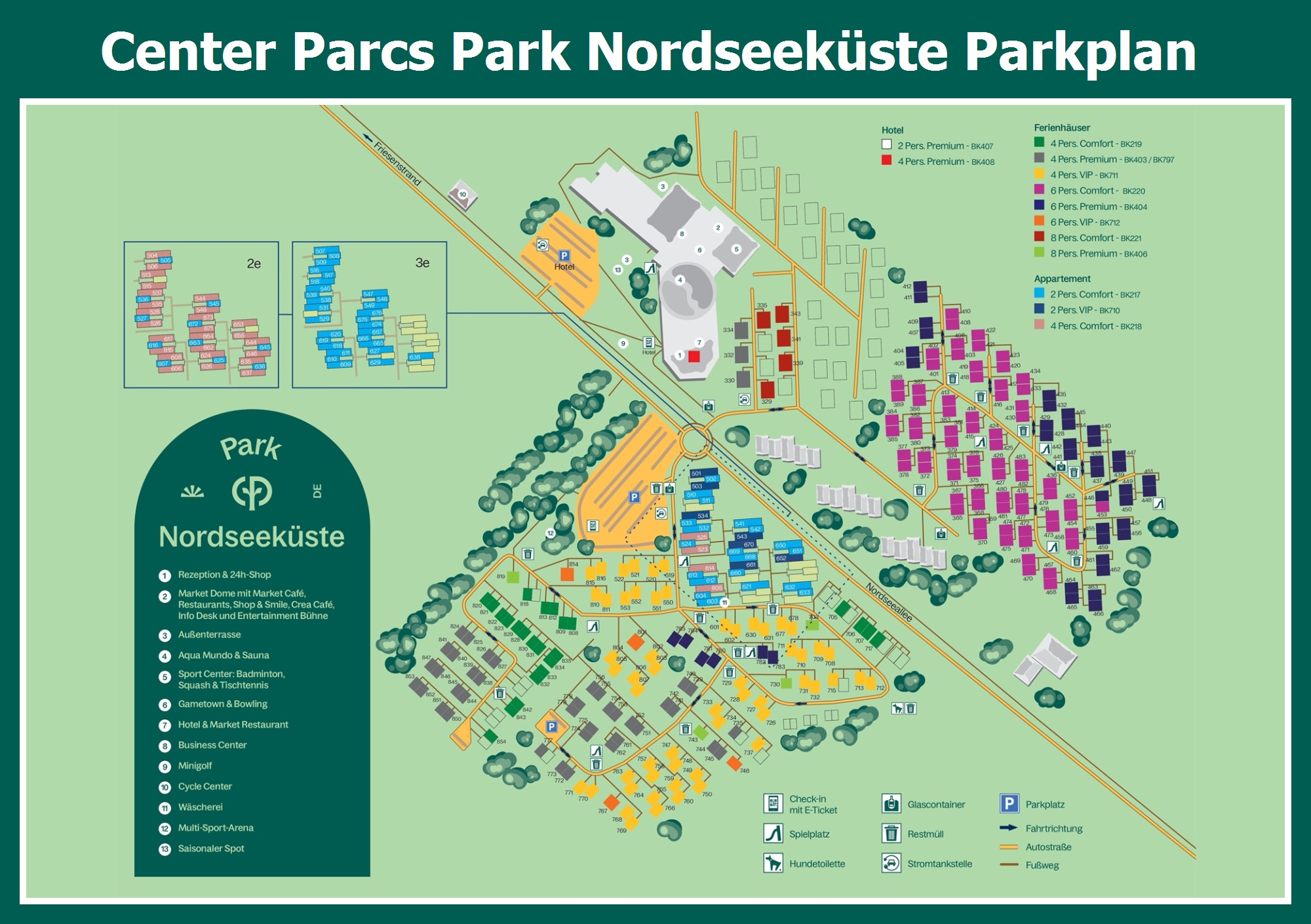 Aktueller und übersichtlicher Parkplan von Center Parcs Park Nordseeküste mit alle Unterkünfte und Einrichtungen, auch als PDF herunterladbar.