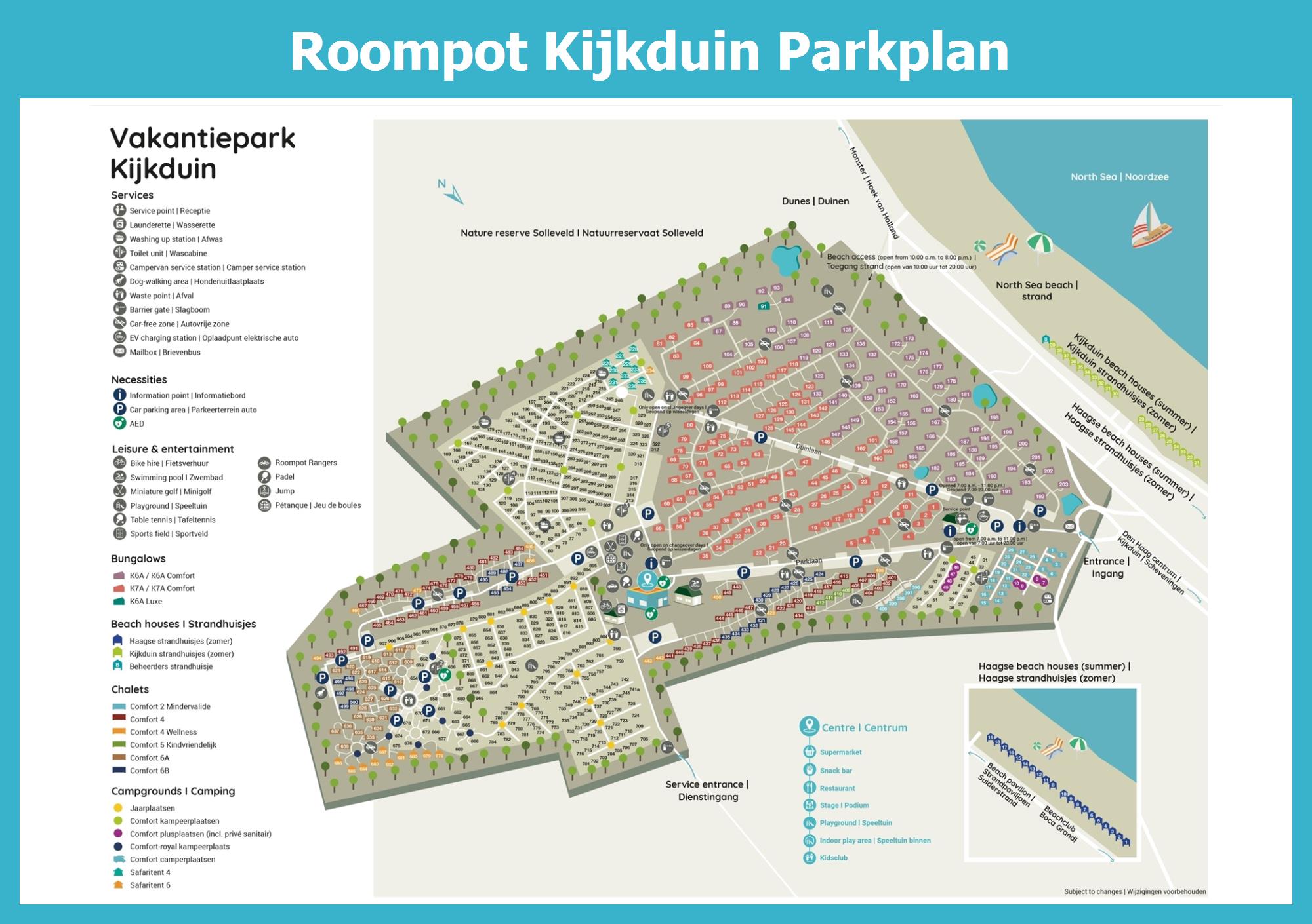Aktueller und übersichtlicher Parkplan von Roompot Kijkduin mit alle Unterkünfte und Einrichtungen, auch als PDF herunterladbar.