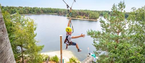 Wouaaah... Et vous voilà parti, à 12 mètres de haut, suspendu à la tyrolienne Zip Wire. À toute vitesse vous fendez l'air, survolant le lac pour atteindre l'île... et revenir à la plateforme de départ. Voici ce qui rend la nouvelle tyrolienne Zip Wire à De Vossemeren unique. Et c'est aussi la plus longue de Flandre : 325 mètres de sensations garanties !